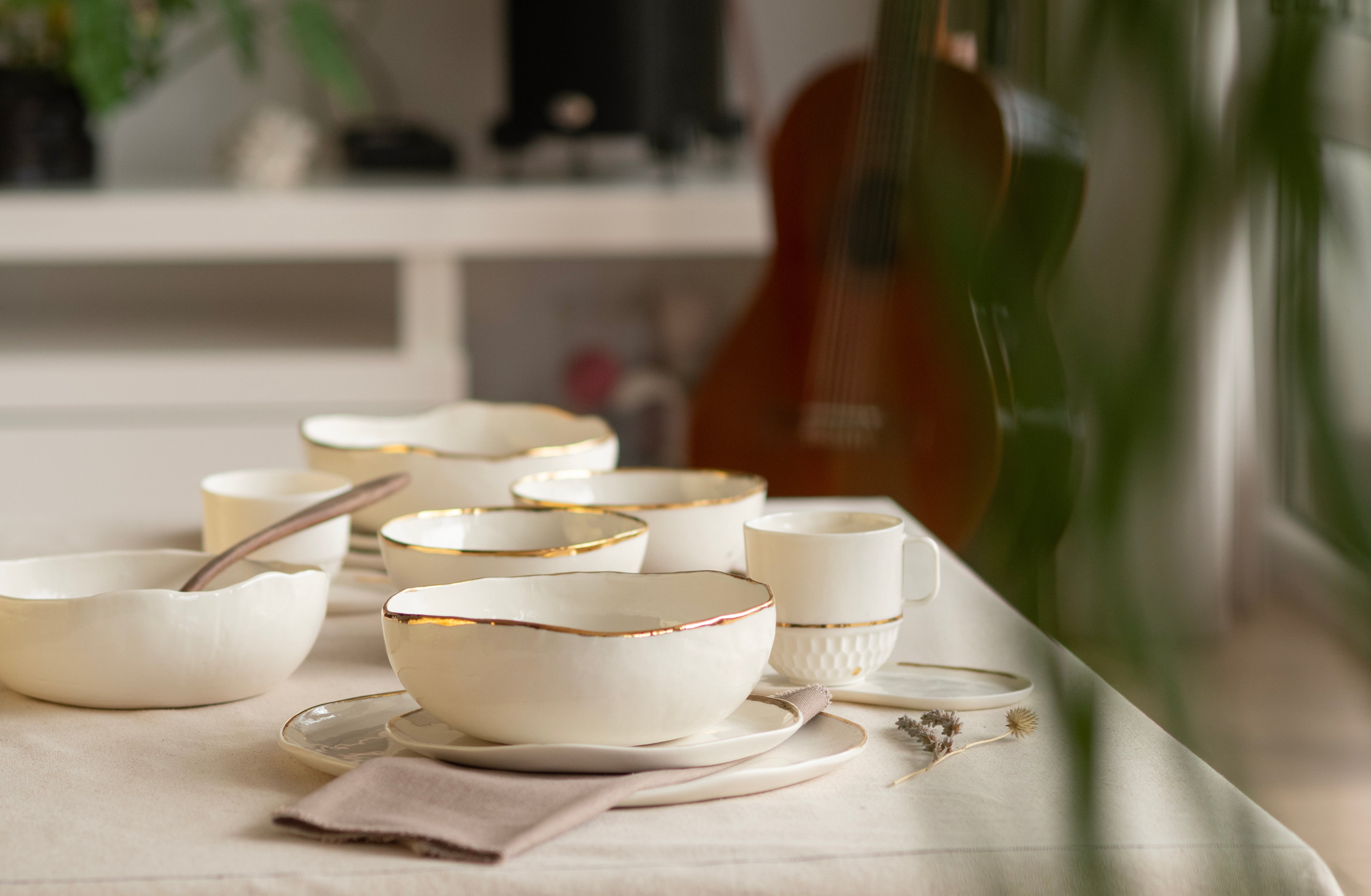 Hikari je nežan i svetao porcelanski set ukrašen linijama zlata, sa tanjirima i činijama koji unose profinjenu jednostavnost u svaki obrok sa akcentom na ručni rad