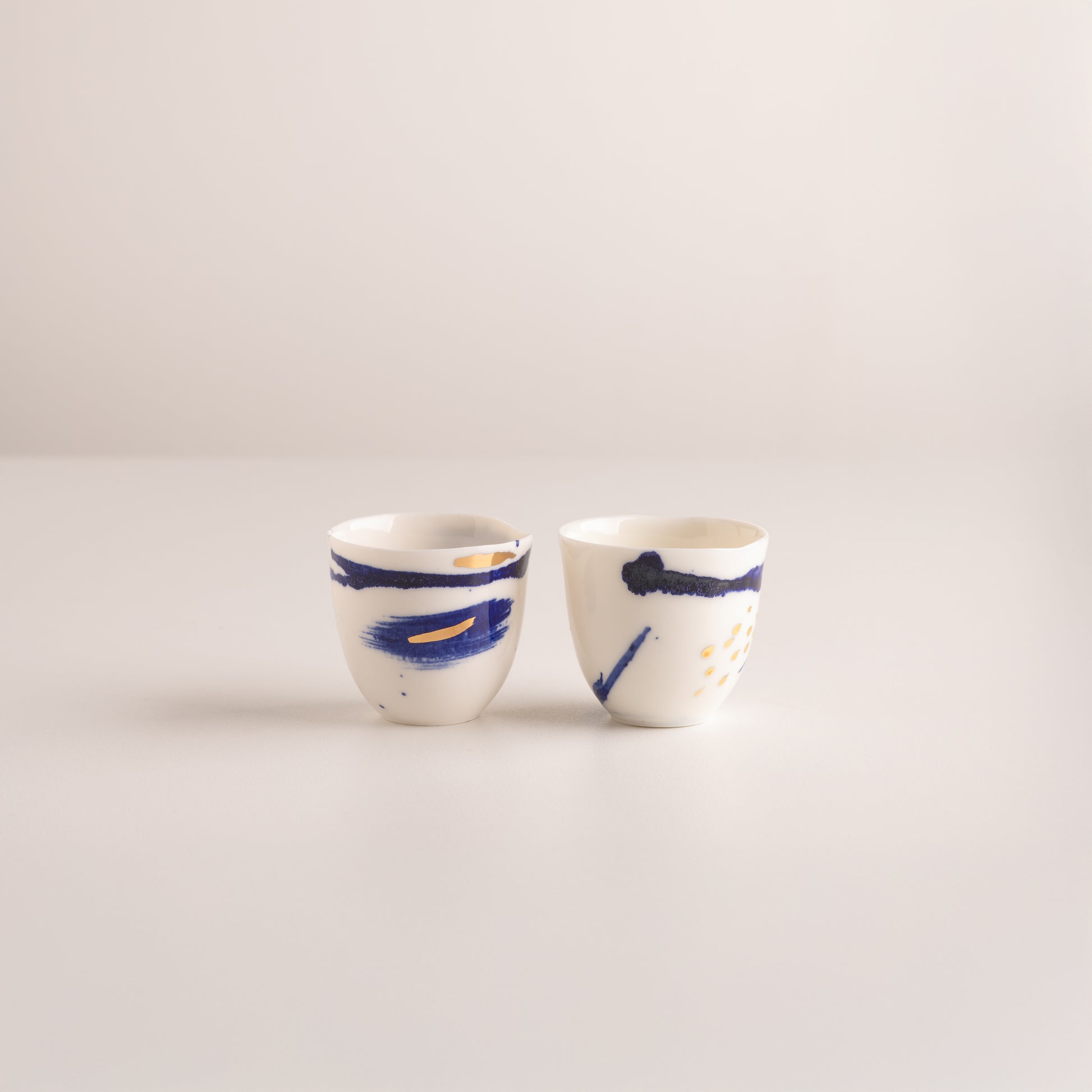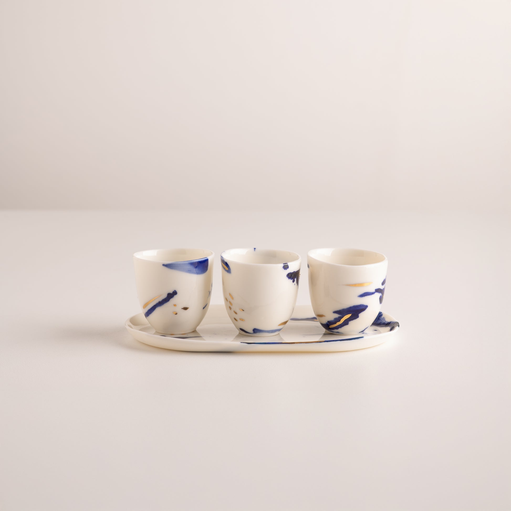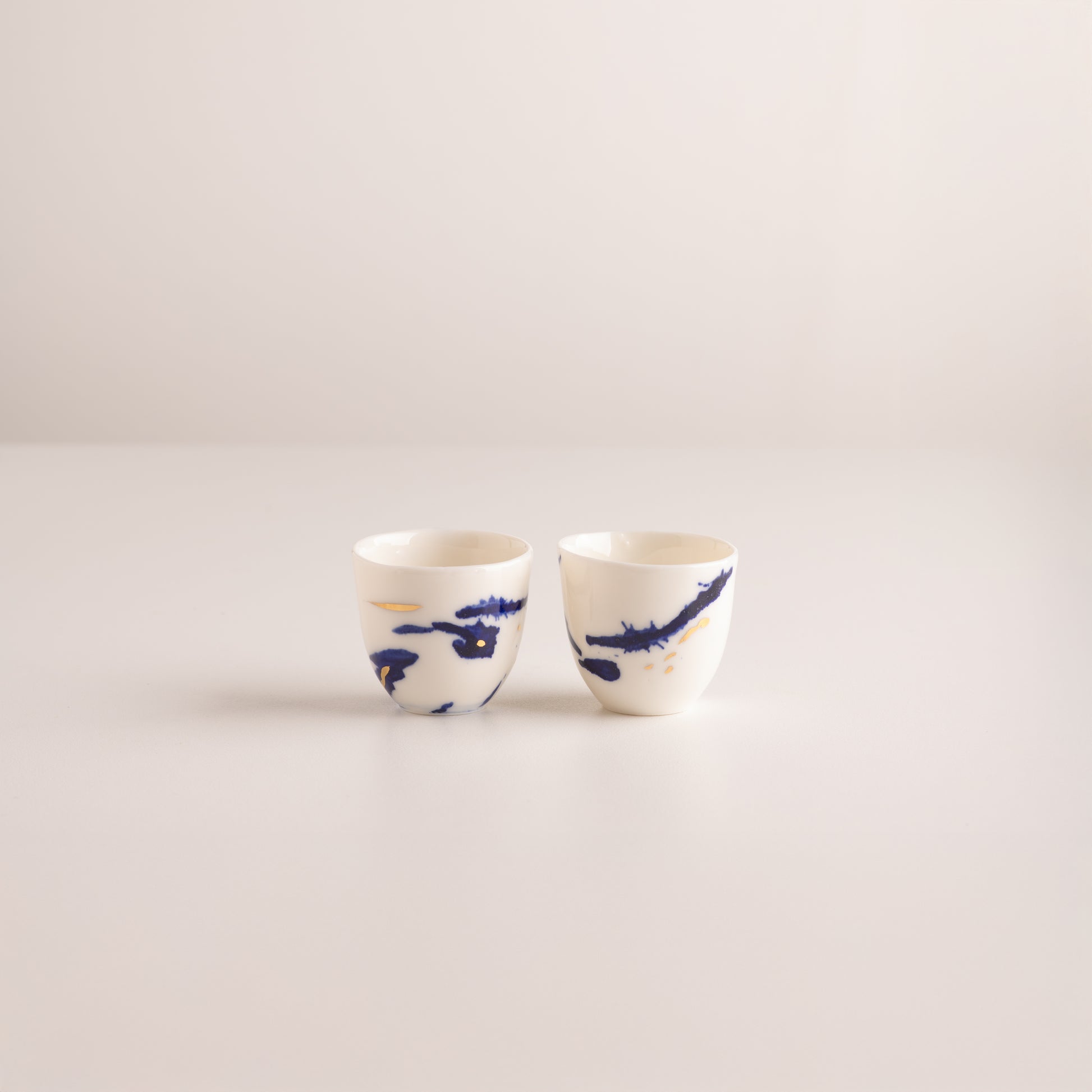 Hand-painted cobalt on translucent porcelain, inspired by the calm reflection of sunlight on the sea.