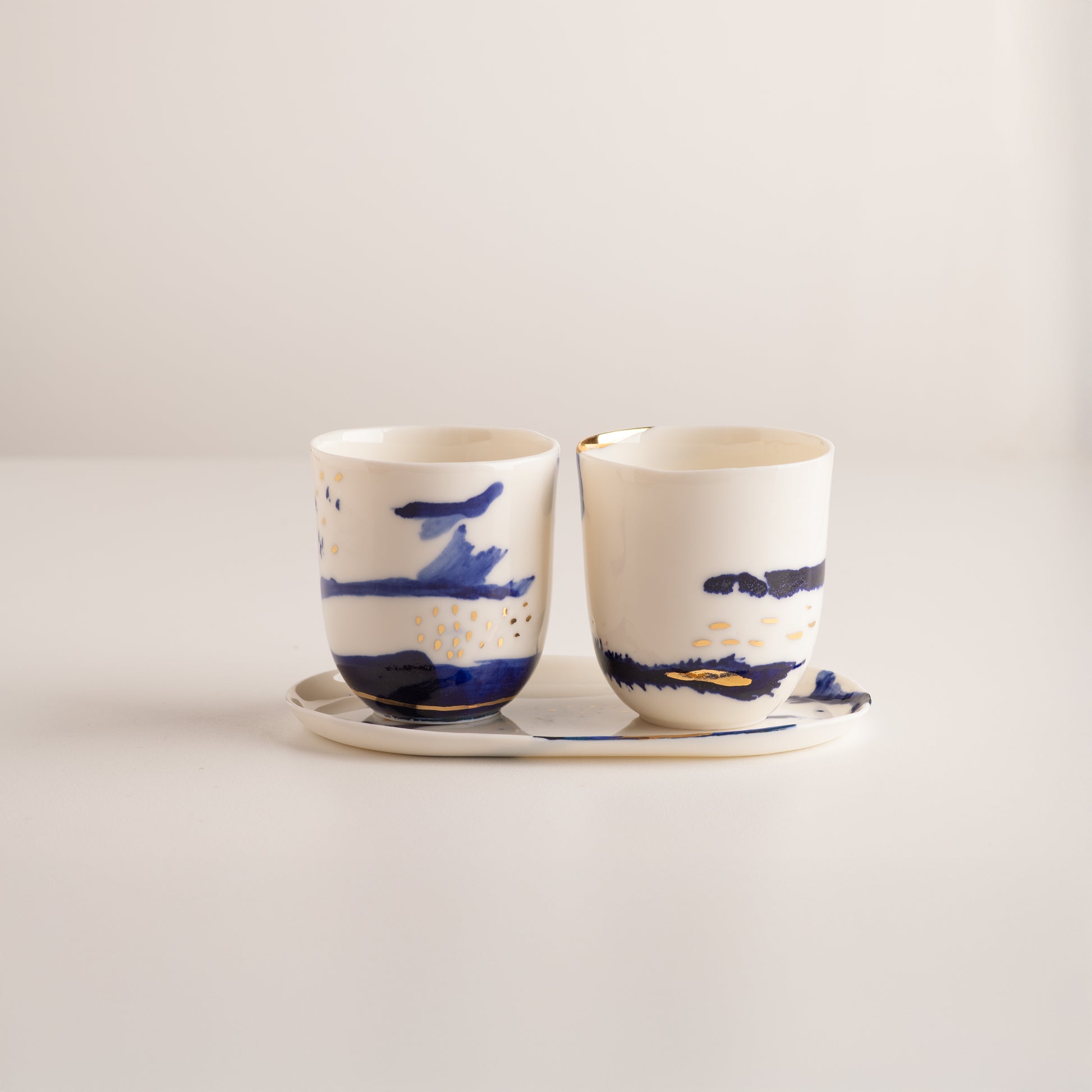 Hand-painted cobalt on translucent porcelain, inspired by the calm reflection of sunlight on the sea.