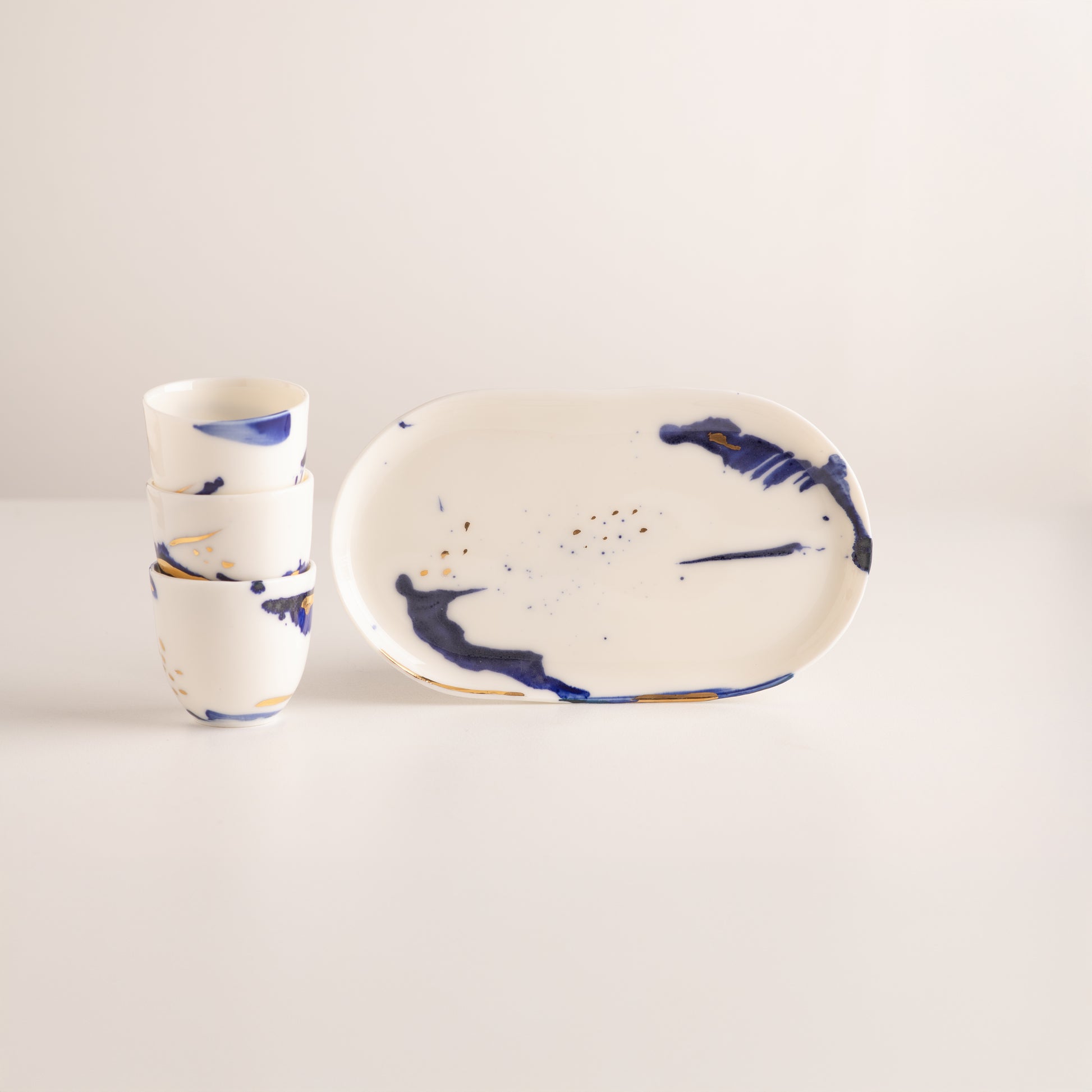 Hand-painted cobalt on translucent porcelain, inspired by the calm reflection of sunlight on the sea.