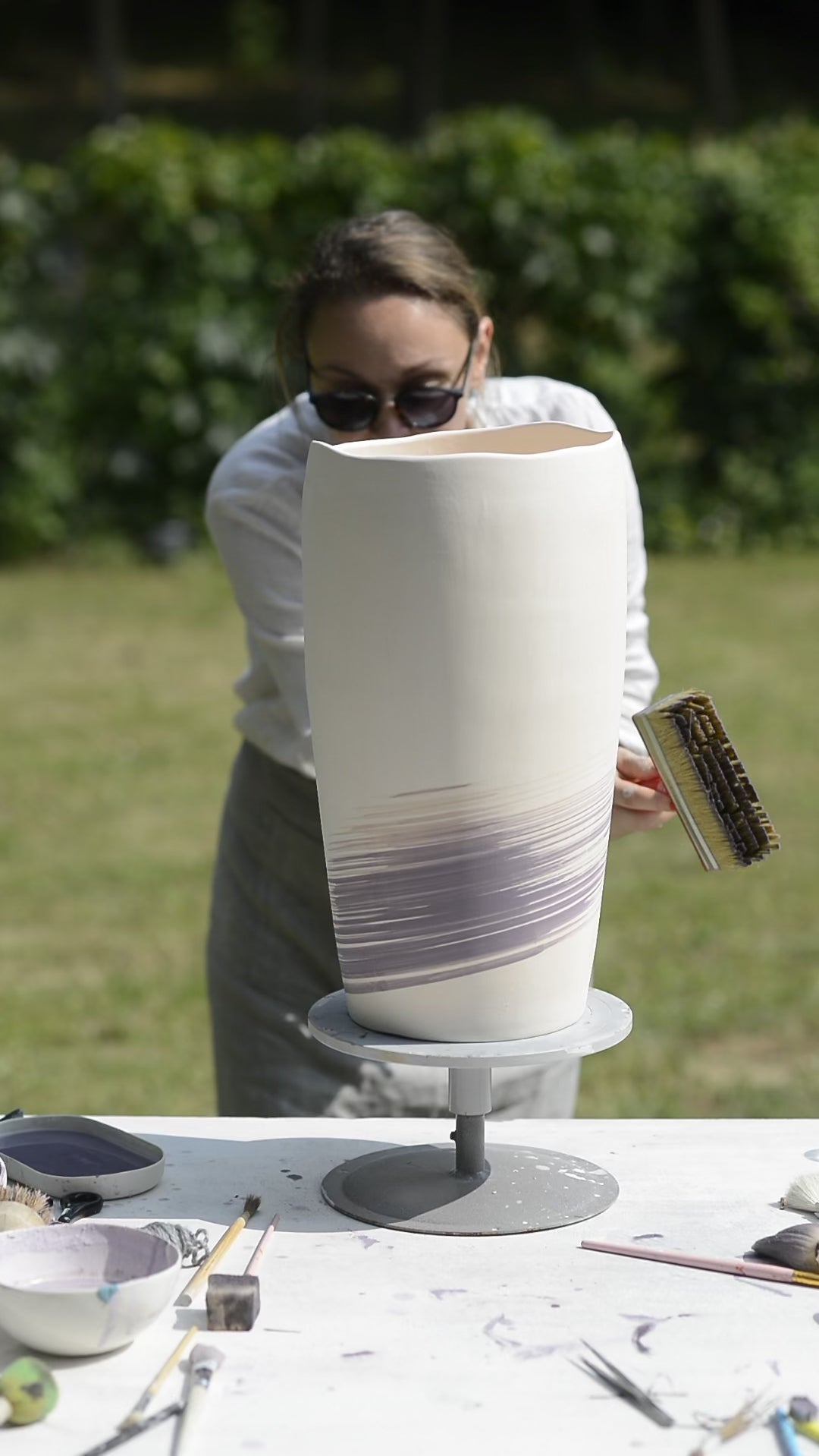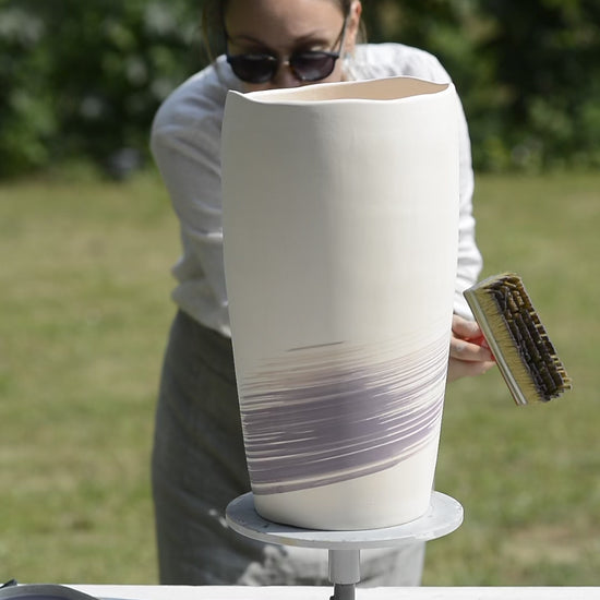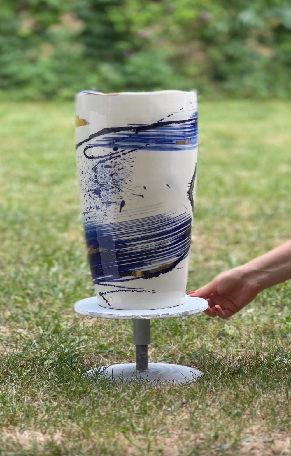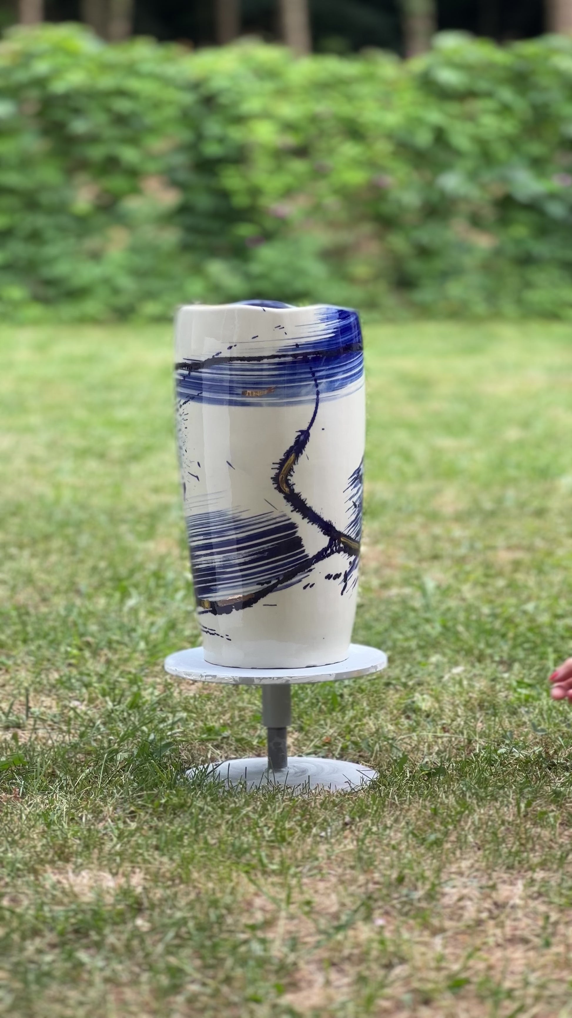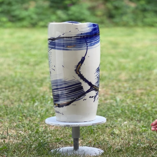 This porcelain vase features intricate hand-painted cobalt and gold accents. Each piece is distinct, ensuring that no two vases are precisely alike.