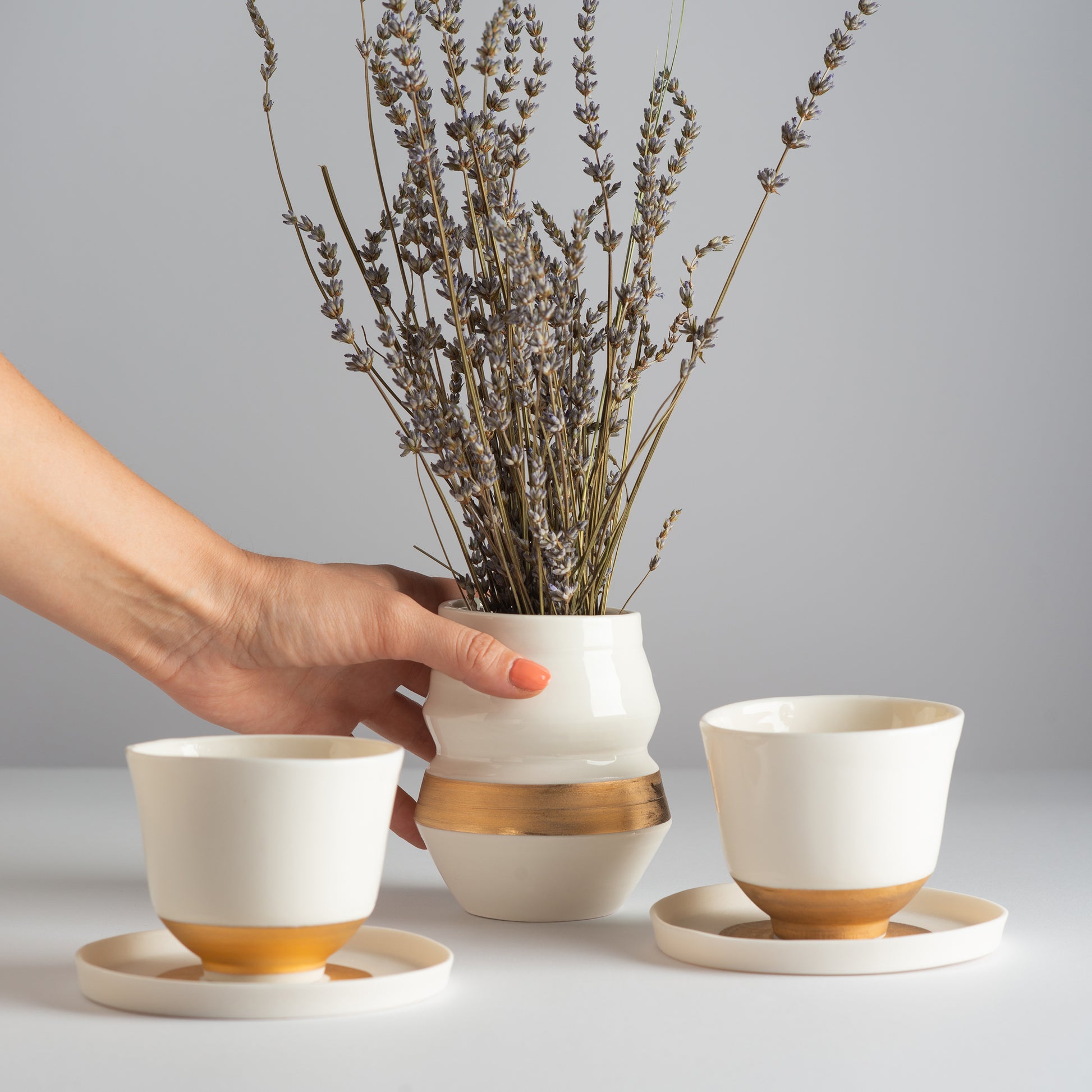 The Kulma cup and saucer are inspired by the early modernism artist Constantin Brancusi and his "Endless column." They embrace straight lines and geometrical shapes that perfectly complement any simple and modern interior. The cup is crafted from translucent porcelain and adorned with gold accents. When combined with a vase in the same style, it creates a perfect gift.