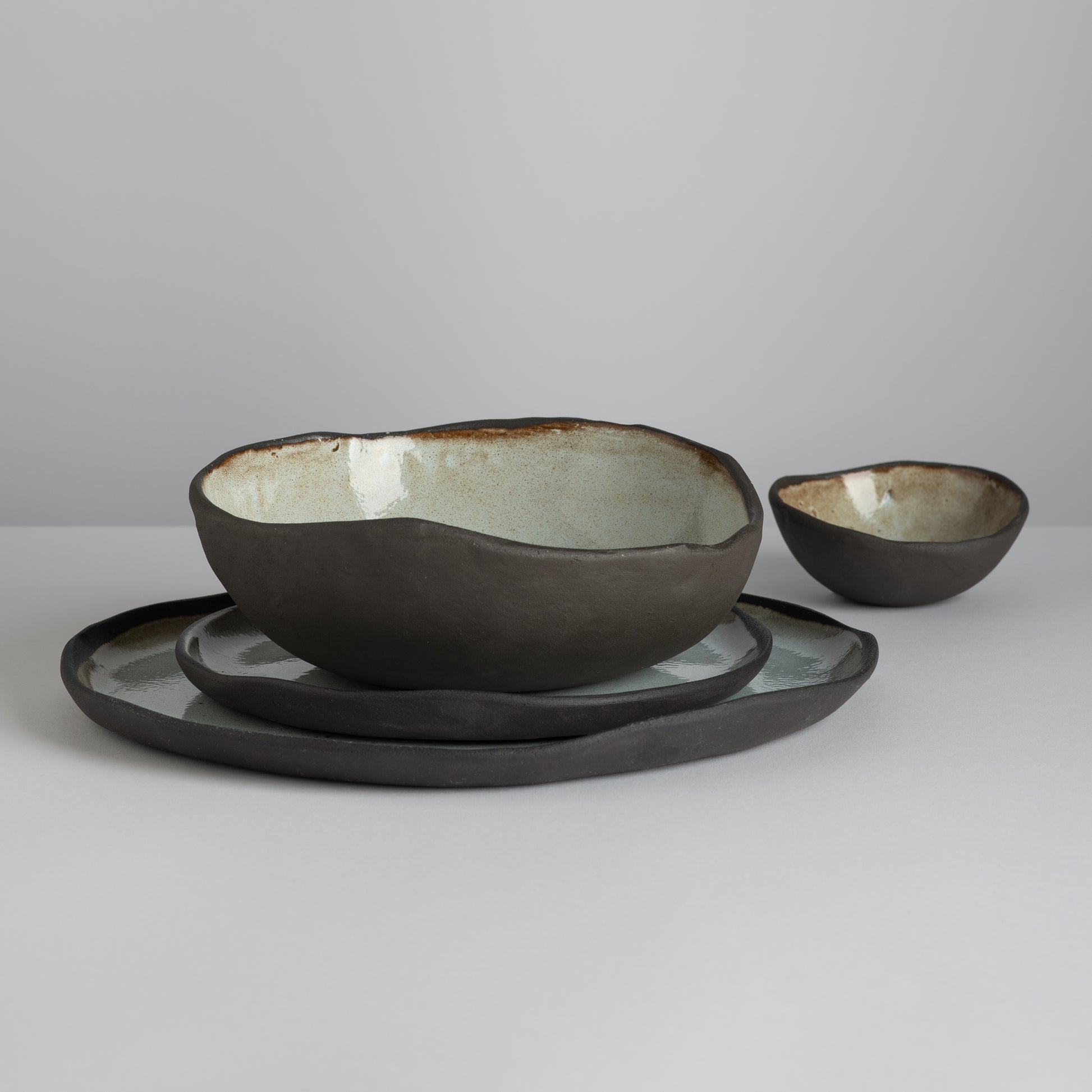 Rustik is a dinnerware set that can handle everyday kitchen challenges. It's simple yet elegant, complements any dish, and is dishwasher safe. Made from black clay and glazed with a rustic bluish glaze.