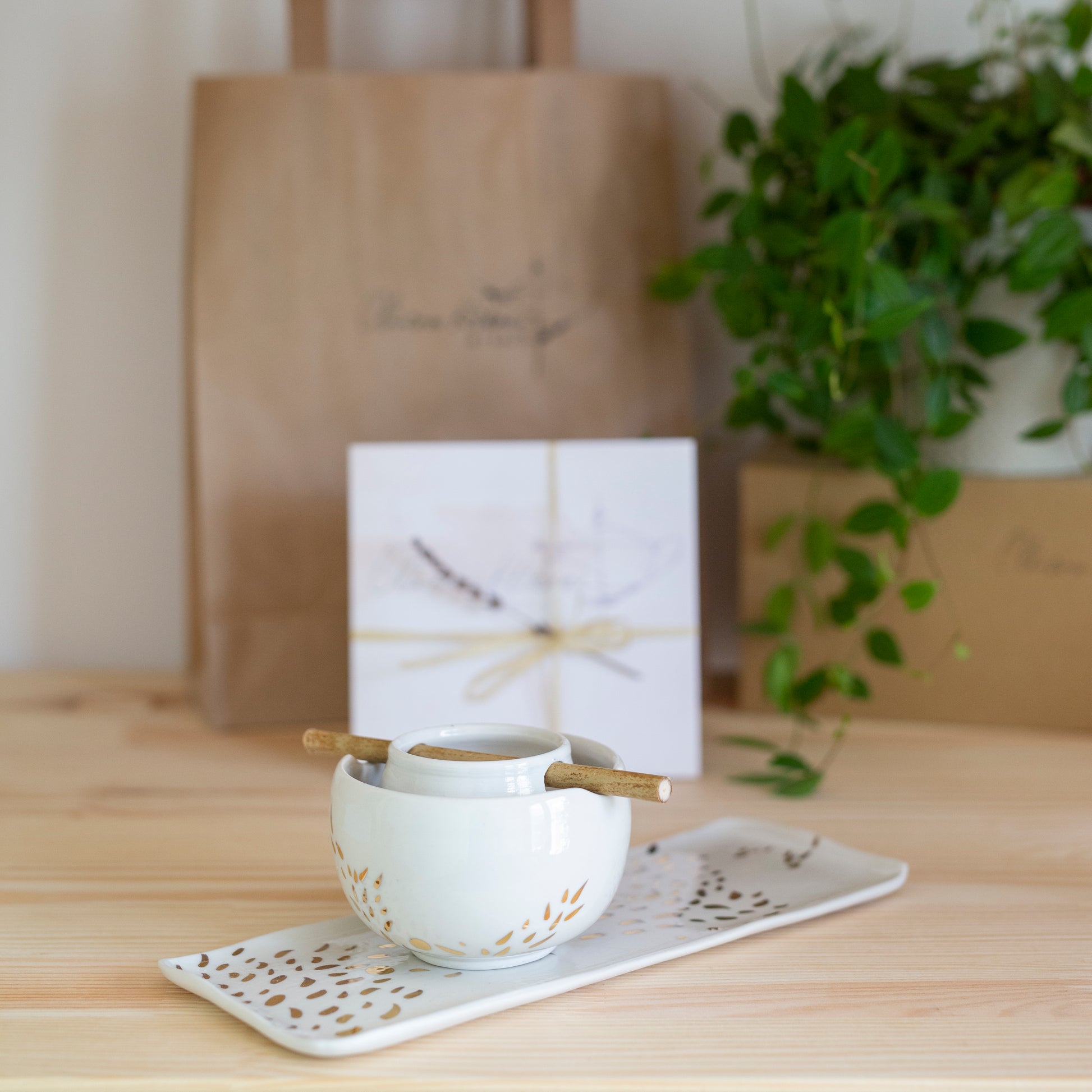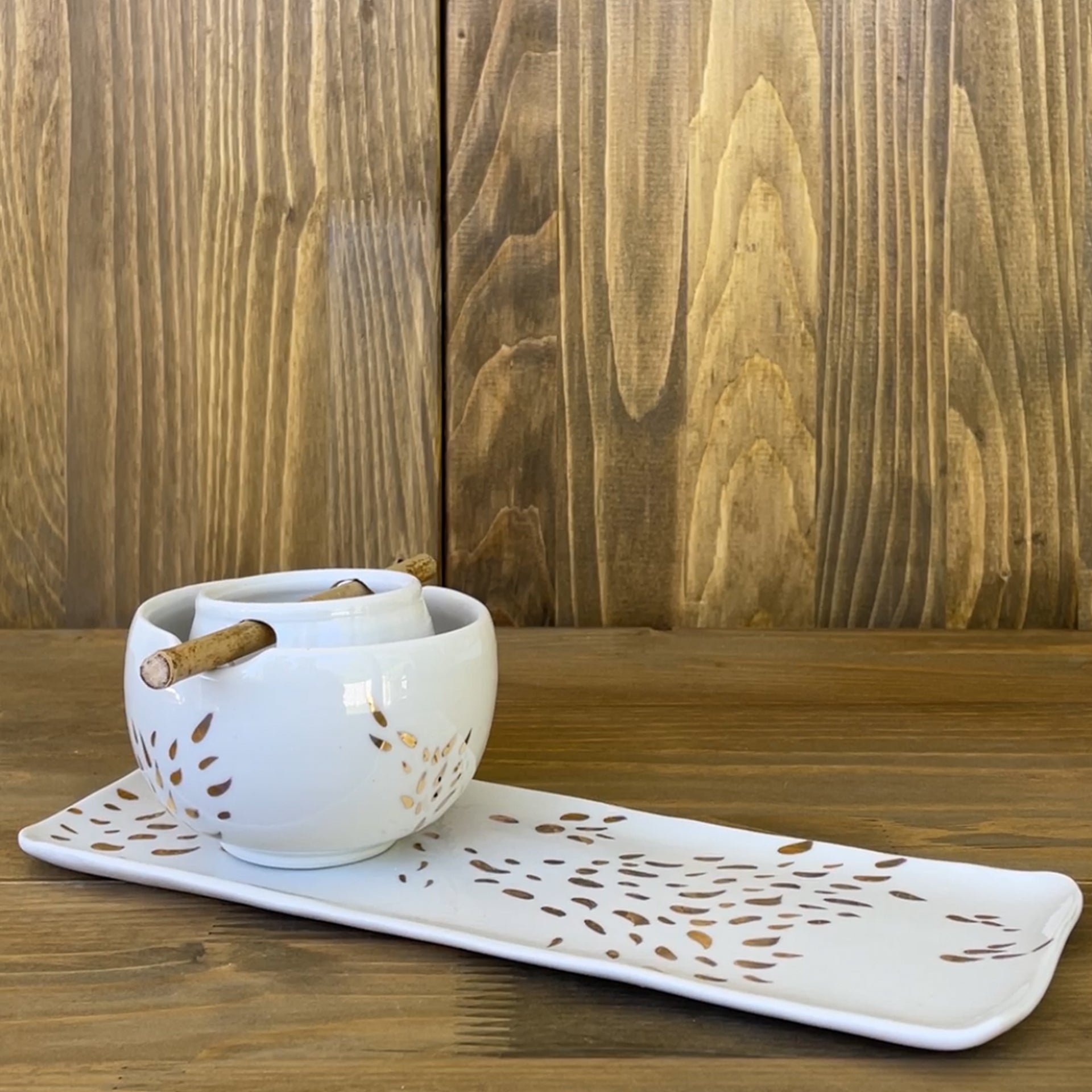 Atakai šolja sa infuzerom za čaj i dugačkim poslužavnikom namenjena je svima onima koji uživaju u ritualu ispijanja čaja i momentima prisutnosti koji taj ritual donosi. Ja ovaj set volim da nazovem još i ''set za čaj za jednu osobu'' , zato što on zaista čini da svaki trenutak korišćenja bude uživanje. Priodno drvo bambusa podražava lepotu ovog seta, a zbog toga što je drvo bambusa antimikrobno i antibakterijsko, to ga čini savršenim kandidatom za setove za čaj sa infuzerom. Ukoliko ste pak raspoloženi za nešto malo drugačije, ceo koncept može da posluži i za kuvano vino, potrebno je samo da ga dobro zagrejete, a u infuzer da ubacite začine. Šolja je zapremine oko 2dl. Ovaj set odlikan je zlatnim potezima četke i svaki je unikatan