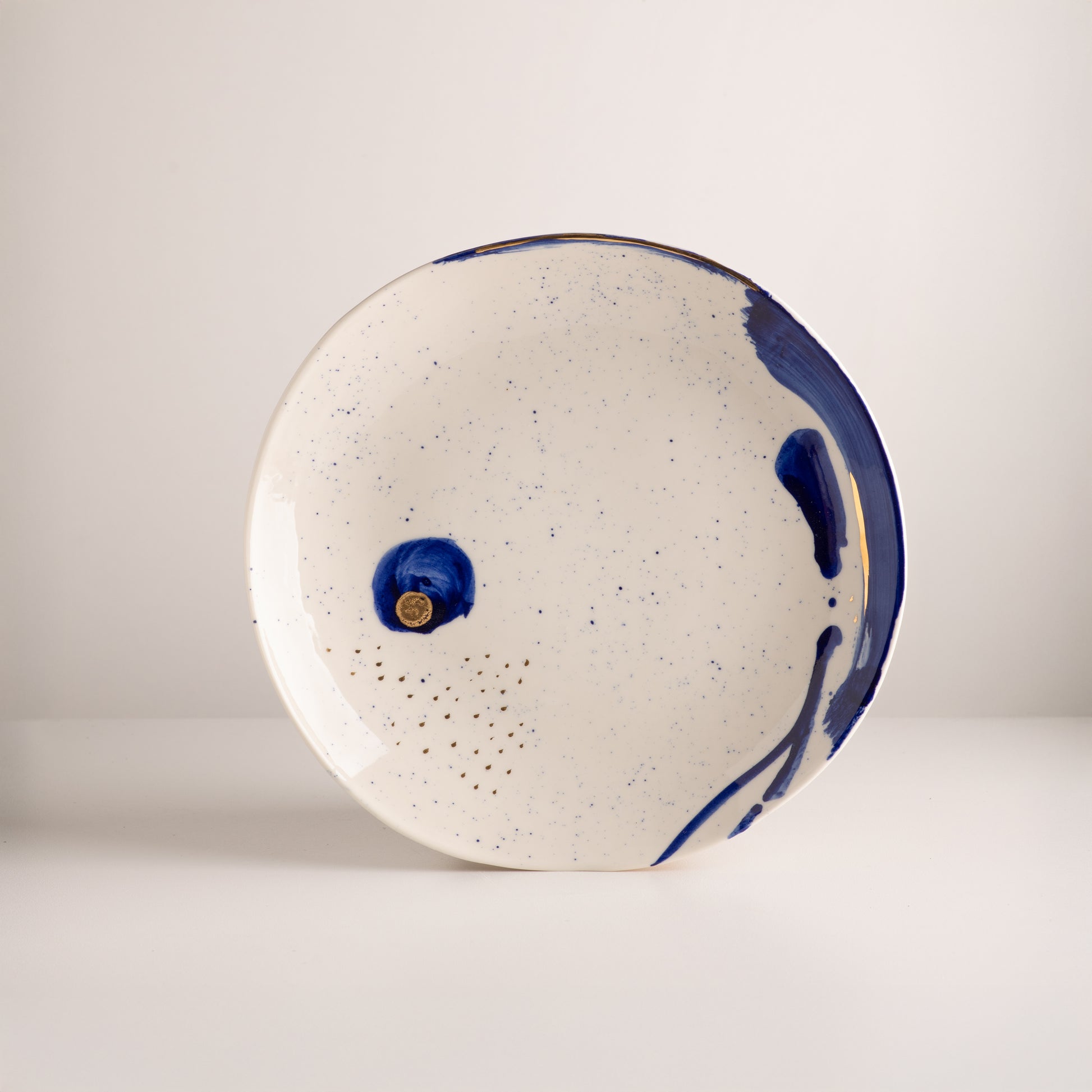 Hand-painted cobalt on white porcelain, inspired by the calm reflection of sunlight on the sea.