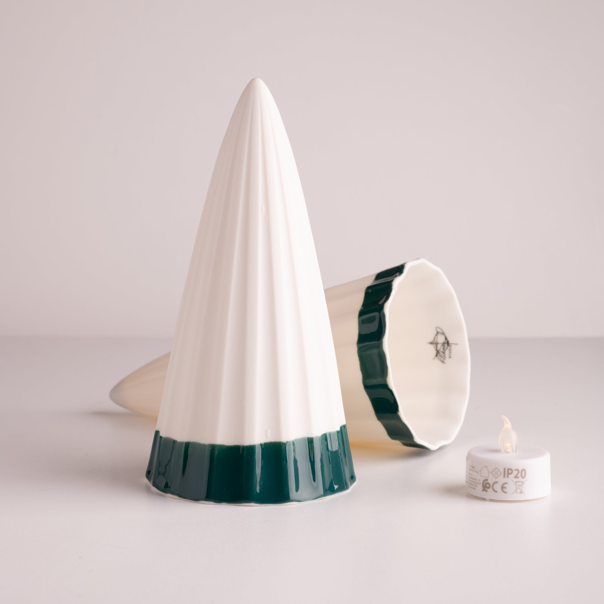 Novogodišnji porcelanski ukras u obliku jelke. Ova jelka napravljena je od prozirnog porcelana. Uz nju se dobija LED svećica sa baterijom. Kada se svećica upali, jelka isijava toplu svetlost i nežno obasjava prostor.