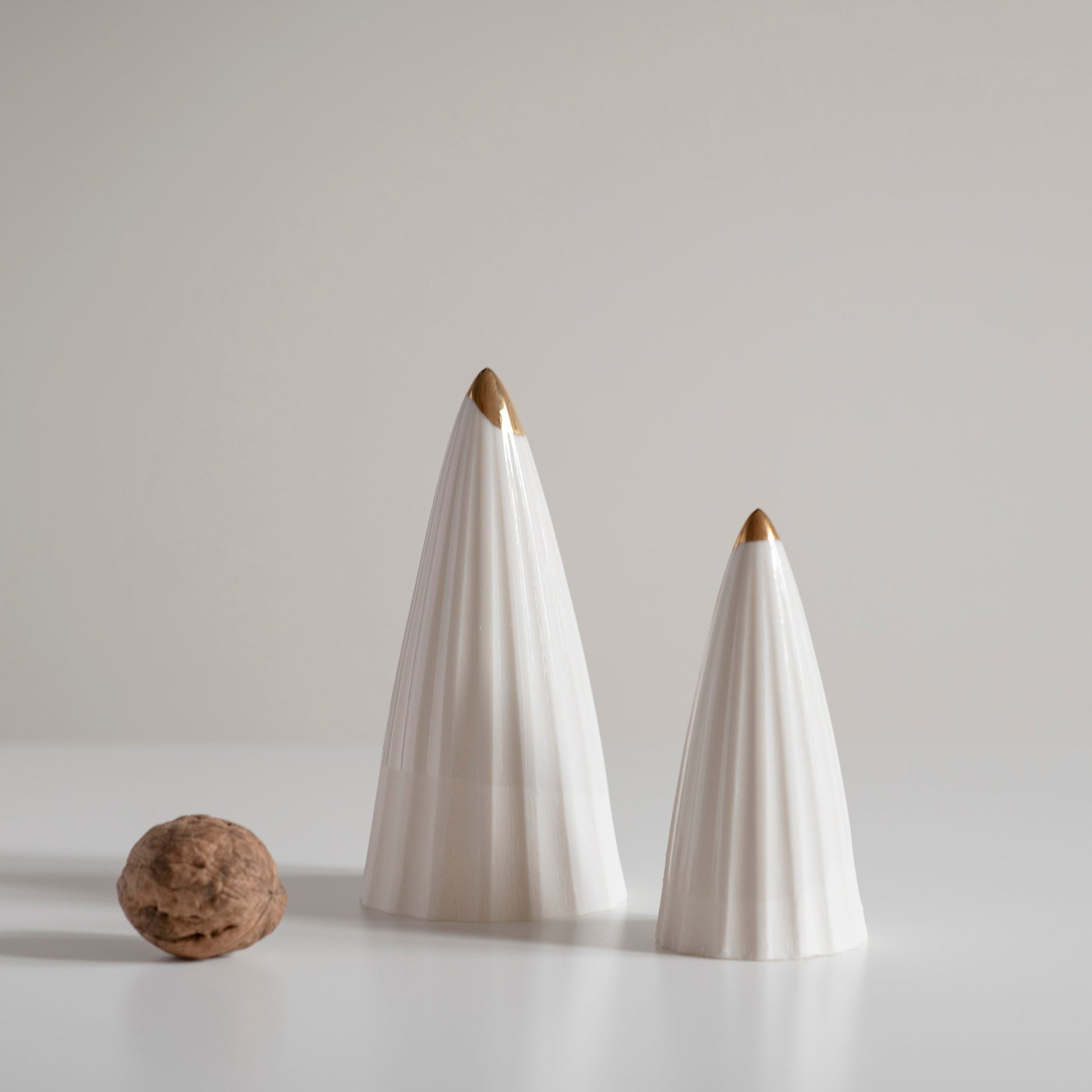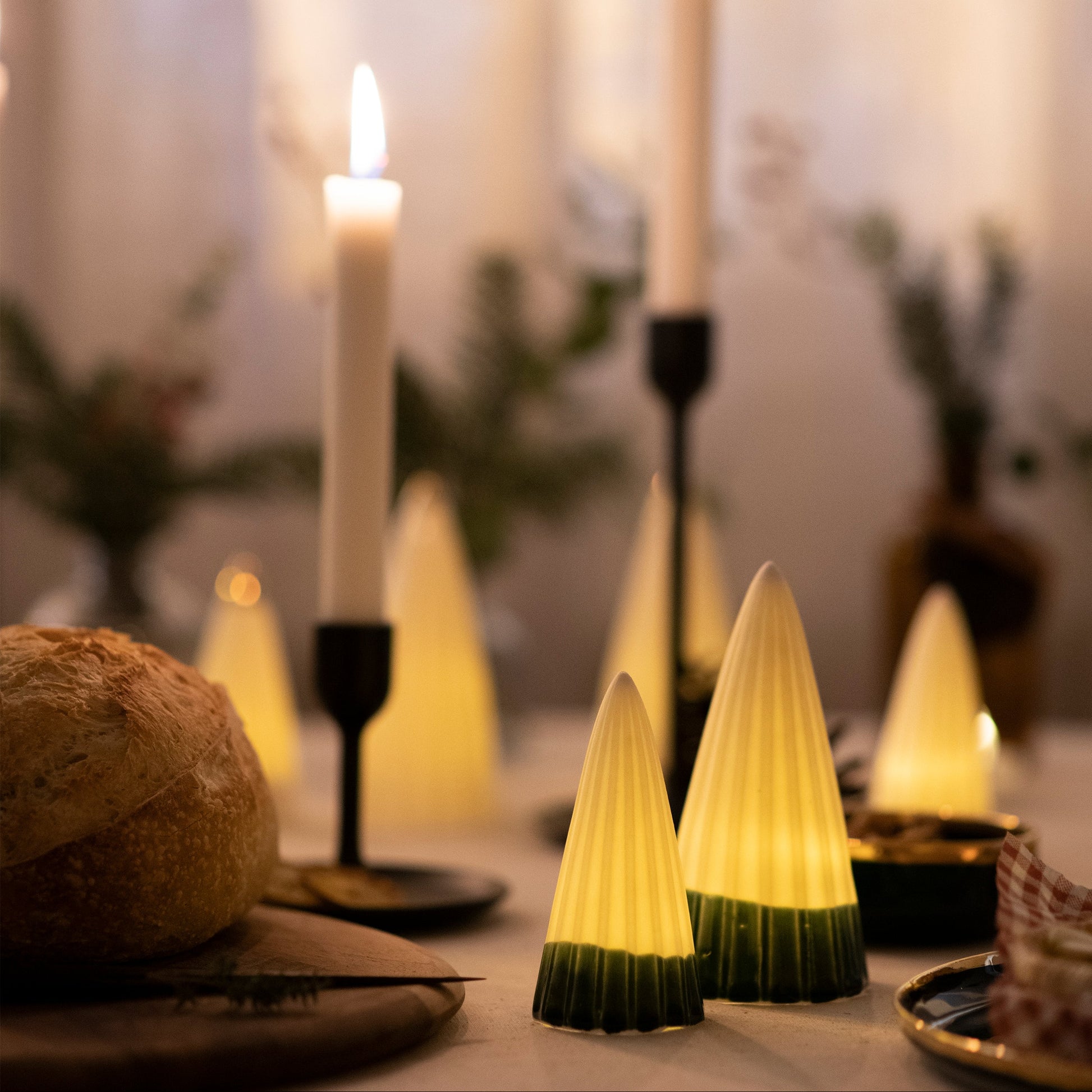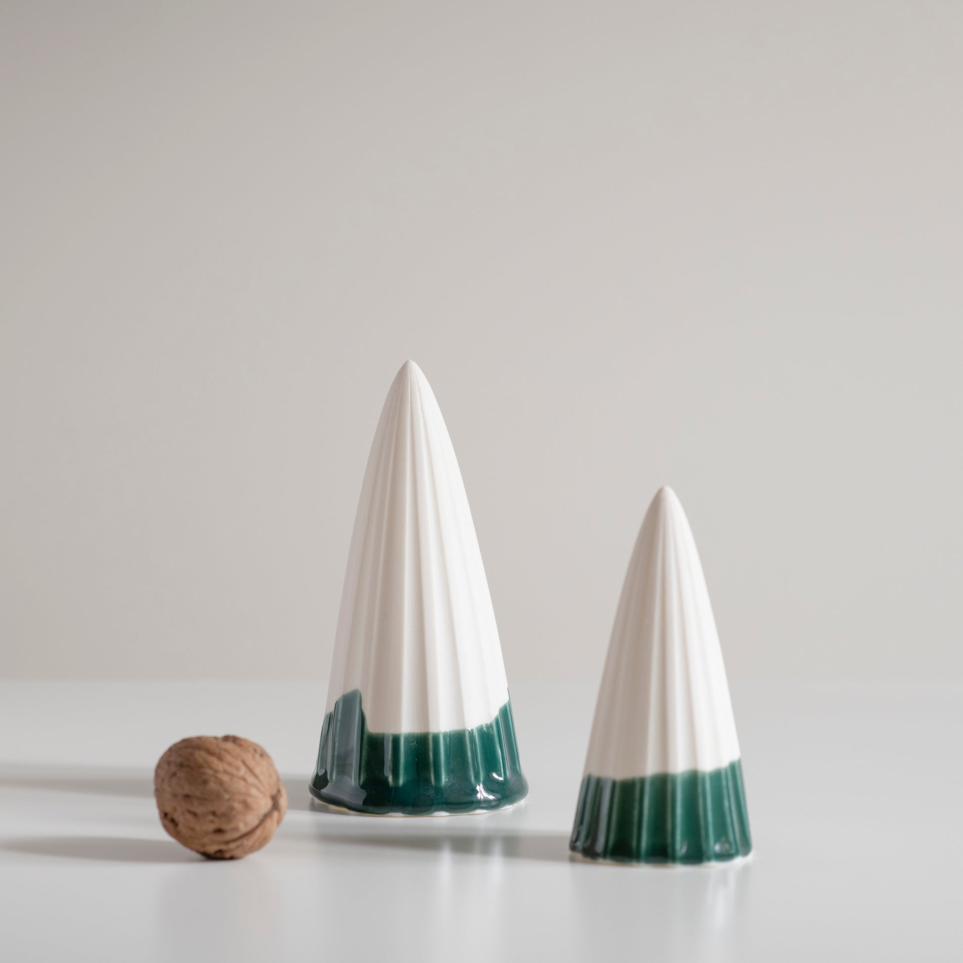 Novogodišnji porcelanski ukras u obliku jelke. Set od dve jelke napravljene od prozirnog porcelana. Uz njih se dobijaju 2 LED svećice sa baterijama. Kada se svećice upale, jelka isijava toplu svetlost i nežno obasjava prostor.