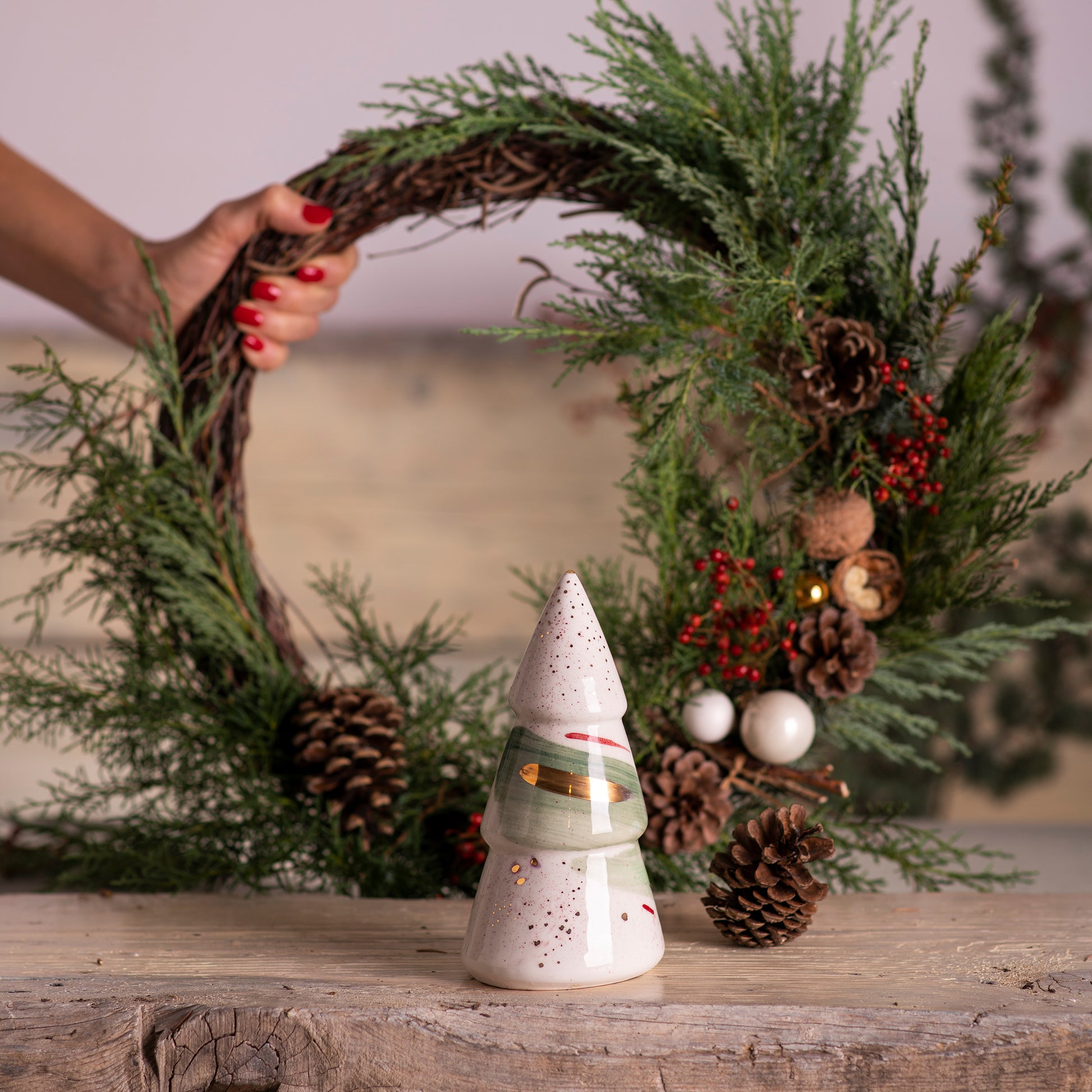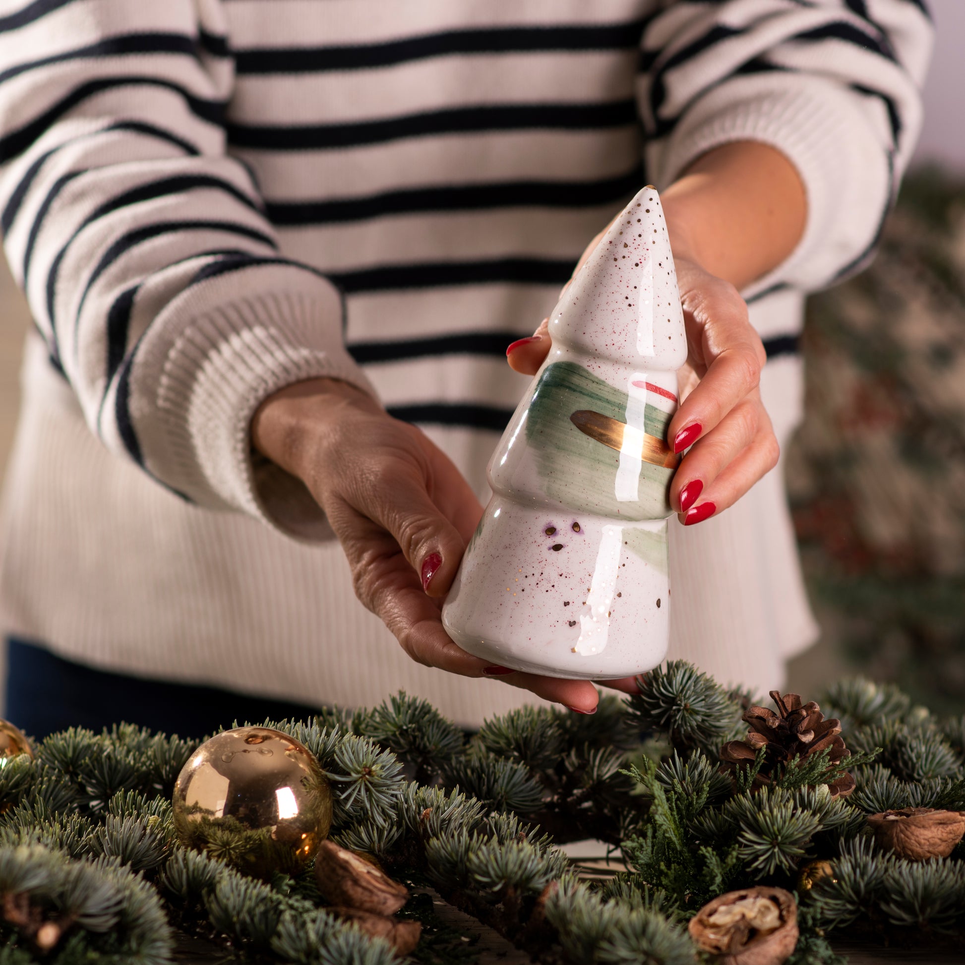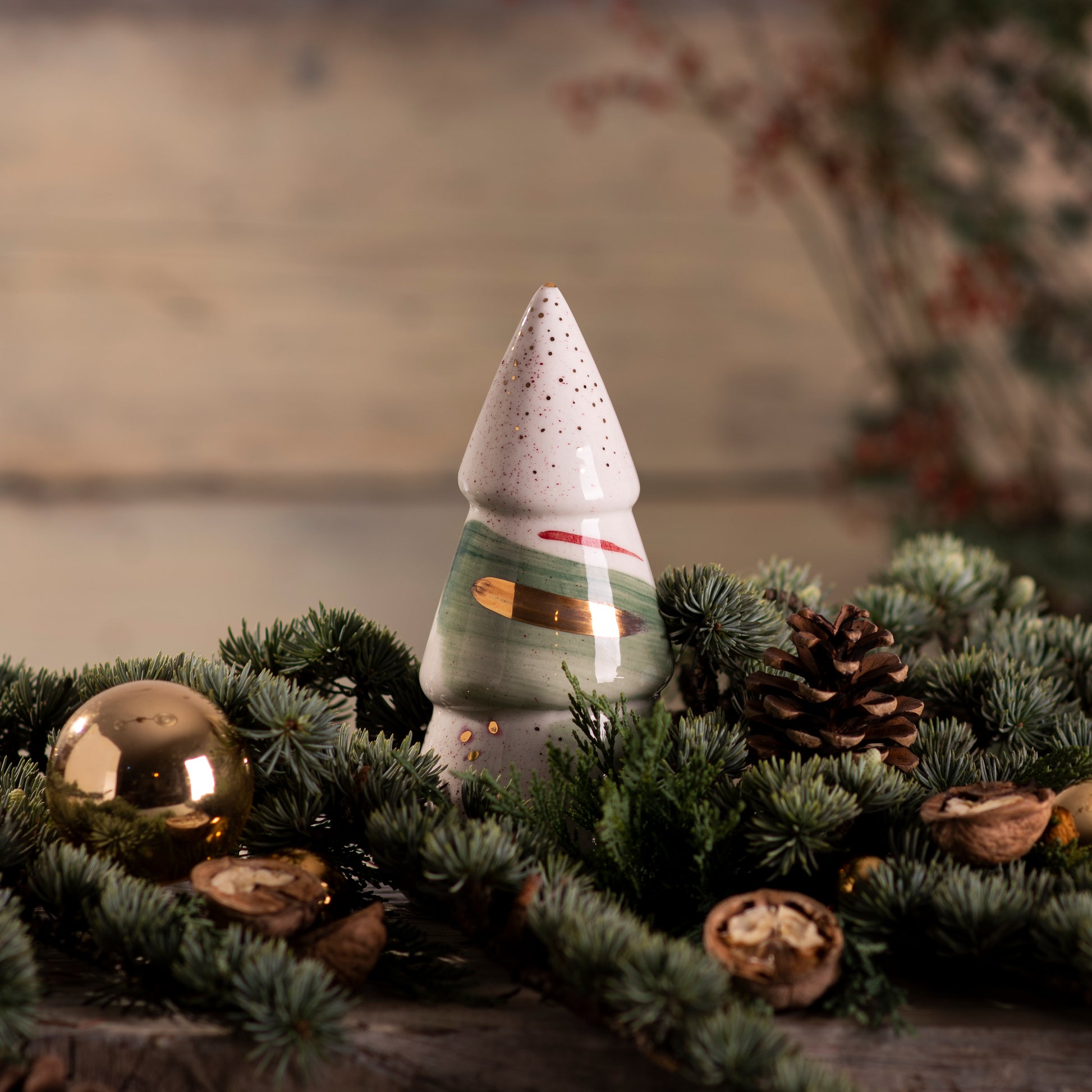Novogodišnji porcelanski ornament u obliku jelke. Svaki komad je unikatan i ručno oslikan bojama za keramiku i tečnim zlatom. Uz ornament je uparen praznični Studio Mušmula venac.