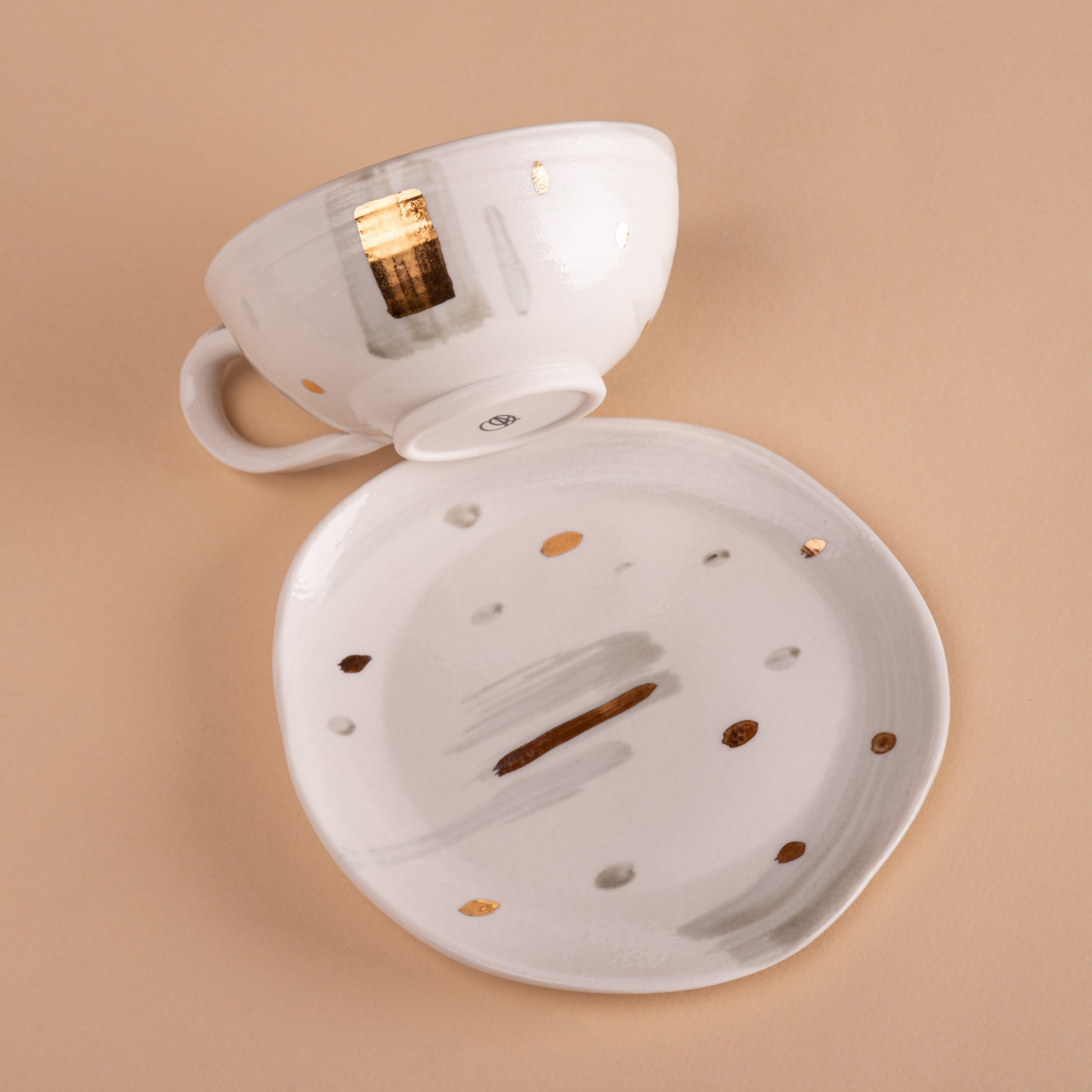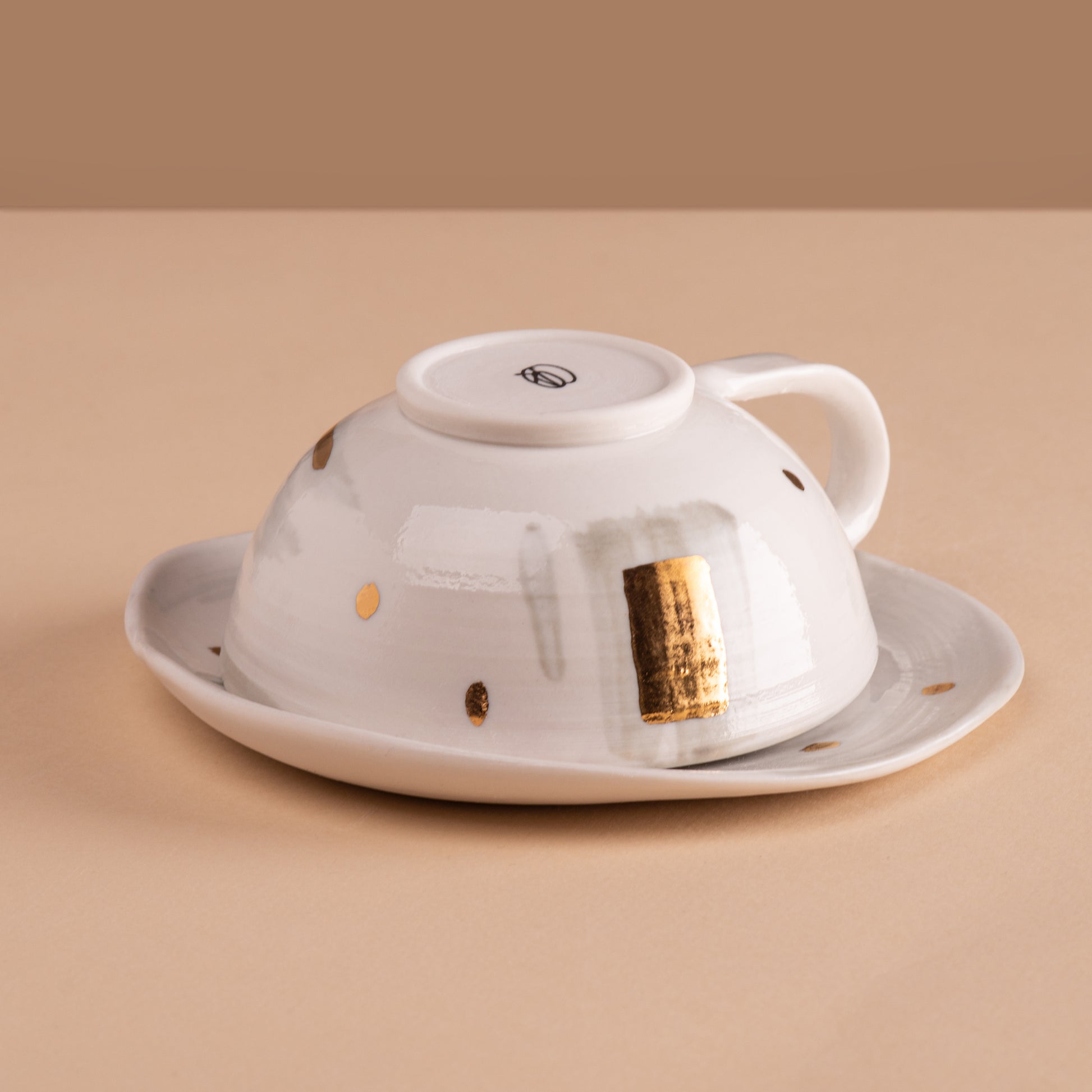 Ali kako bi ovaj set bio savšen, bilo je neophodno nešto što će razbiti simetriju koju točak nameće, pa tako tacna ima organsku formu koja doprinosi balansu ovog seta za kafu ili čaj.