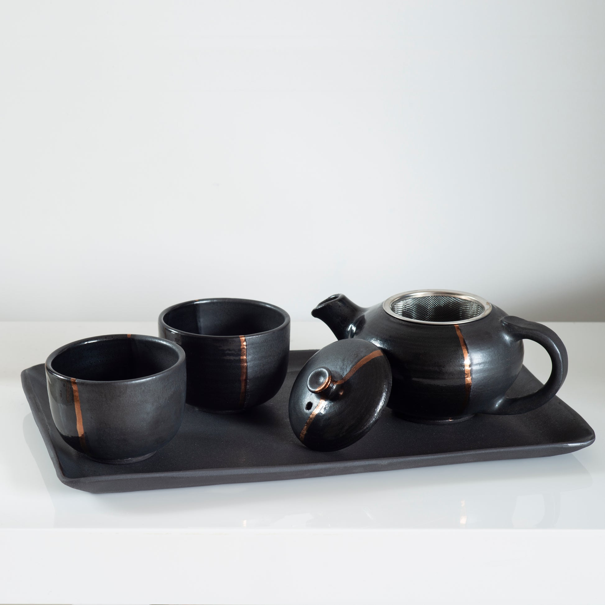 Gongfu set za čaj napravljen je na keramičkom točku od fine, crne gline. Glaziran je ručno pravljenom sjajnom i mat glazurom koje deli bakarna linija. Set sadrži okrugli ili četvrtasti tanjir, čajnik sa metalnim infuzerom i dve šolje zapremine oko 140ml