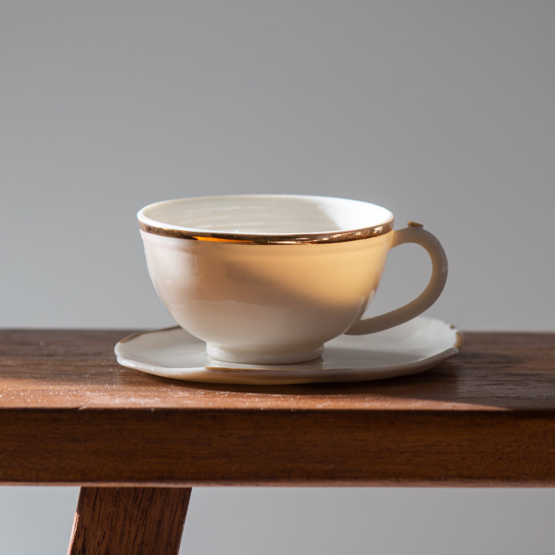 Ova šoljica napravljena je na keramičkom točku od jednog od najkvalitetnijih porcelana na svetu. Oblik šolje predstavlja omaž tradicionalnom kineskom oblku šoljica kakve su najčešće bile pravljene od porcelana sa koštanim pepelom. Uz njih su uparene ručno modelovane tacnice nepravilnog oblika.